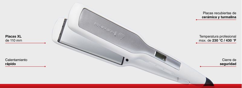 • Placas recubiertas de cerámica + turmalina • Placas extra anchas de 5 cm • Placas flotantes de 110 mm • Temperatura máxima de 230˚C • Calentamiento rápido Apagado automático • Cierre de seguridad Cable giratorioGarantía de 2 años